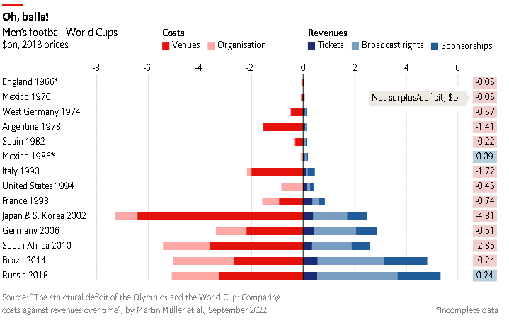 Between 1964 and 2018, 31 out of 36 big events (such as World Cups or summer and winter Olympics) racked up chunky losses, according to researchers at the University of Lausanne. Of the 14 World Cups they analysed, only one has ever been profitable: Russia’s in 2018 generated a surplus of $235m, buoyed by a huge deal for broadcasting rights. Still, the tournament only managed a 4.6% return on investment. (The data for Mexico’s World Cup in 1986 is incomplete. It probably ran a deficit.)